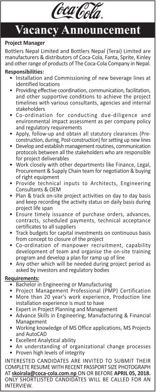 - Project Manager Position Vacancy @ Bottlers Nepal Limited(Coca-Cola)