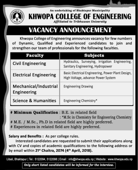 - Faculty Positions Vacancy @ Khwopa College of Engineering
